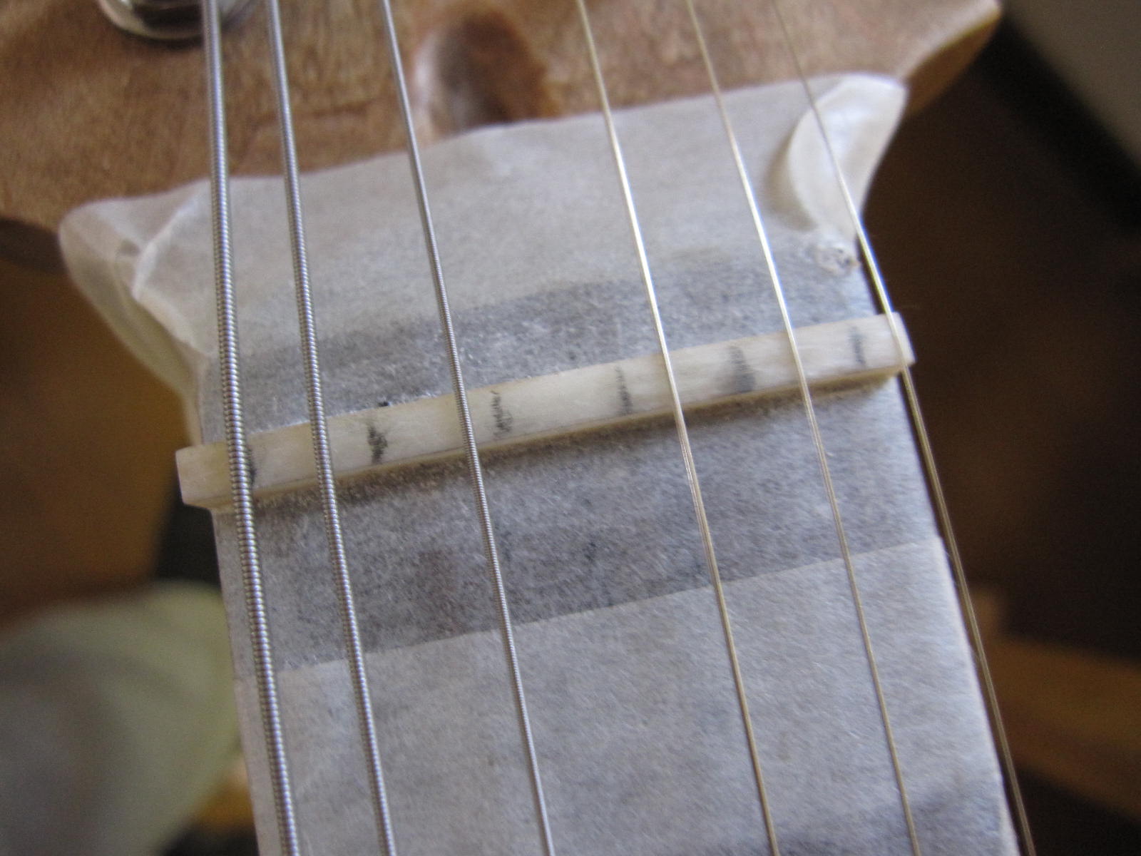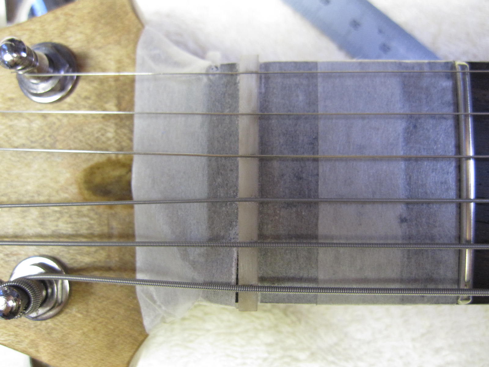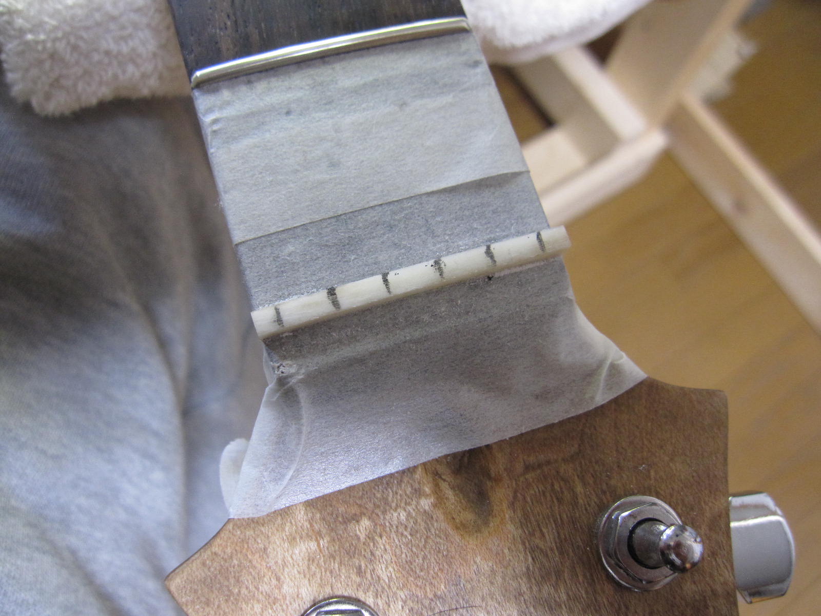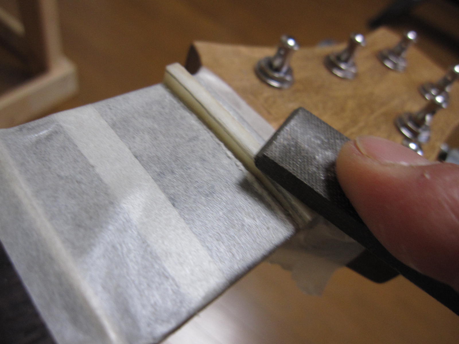 次は、弦をはって、ナット加工です。