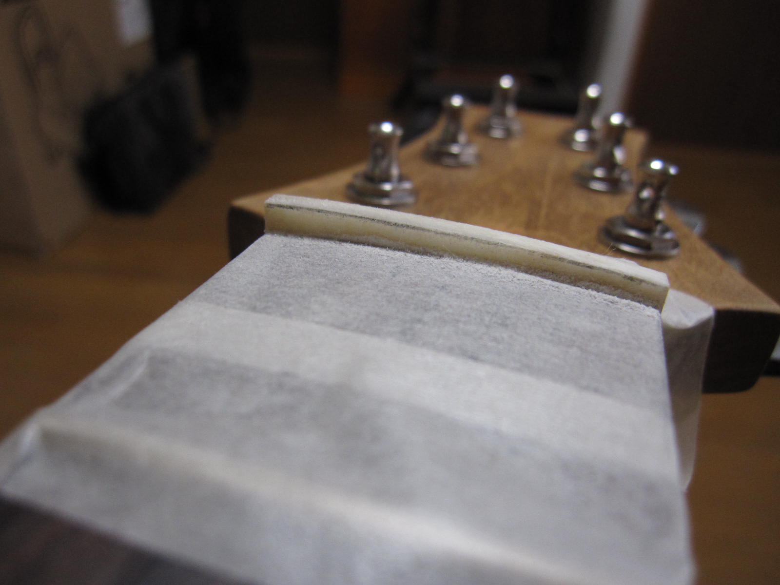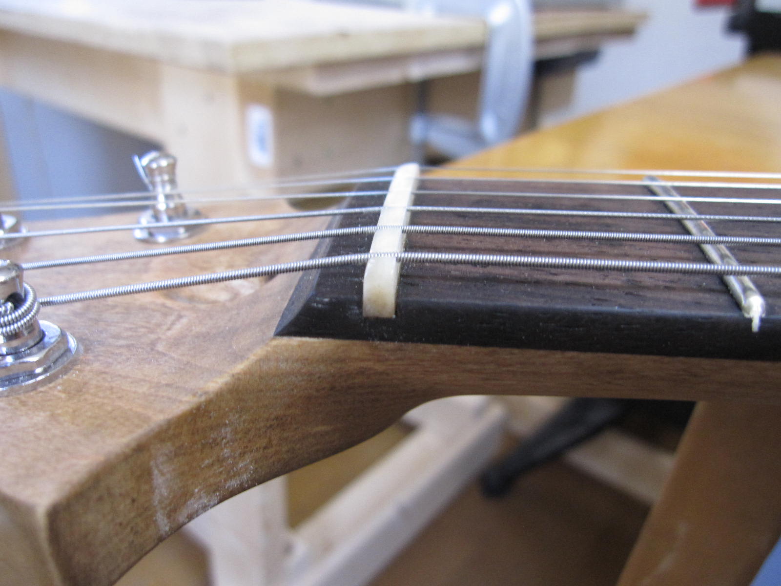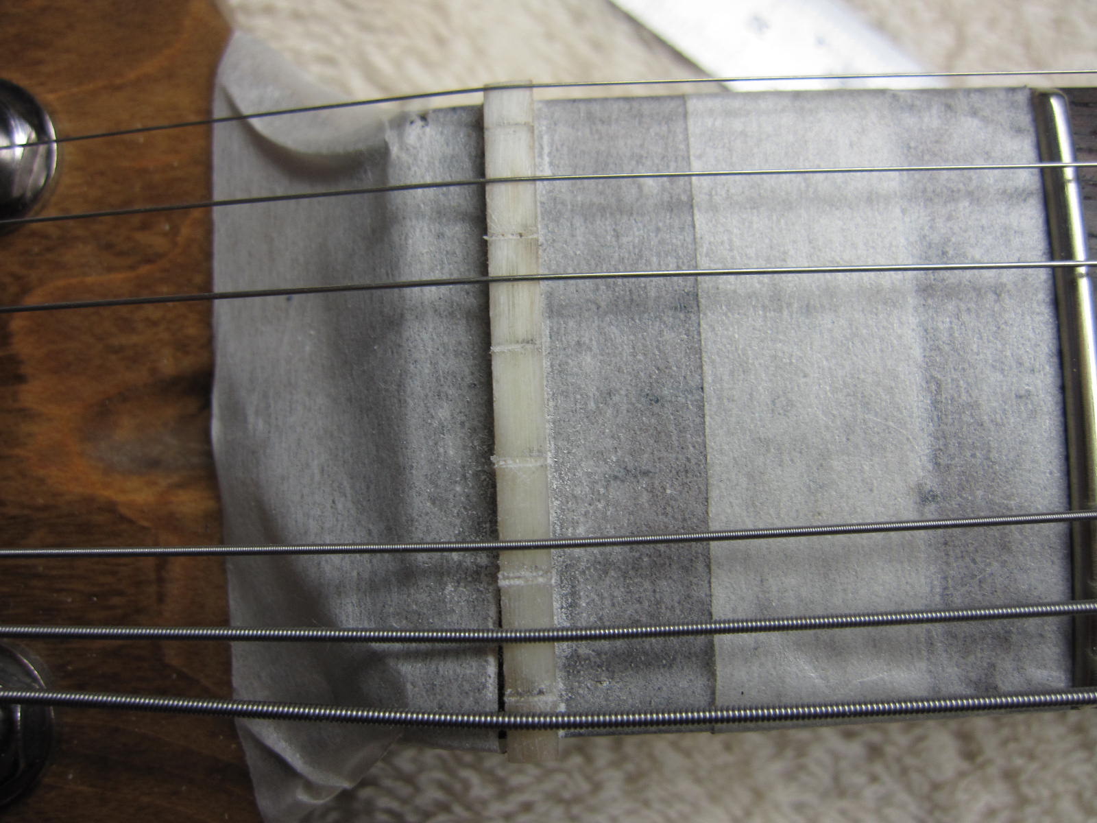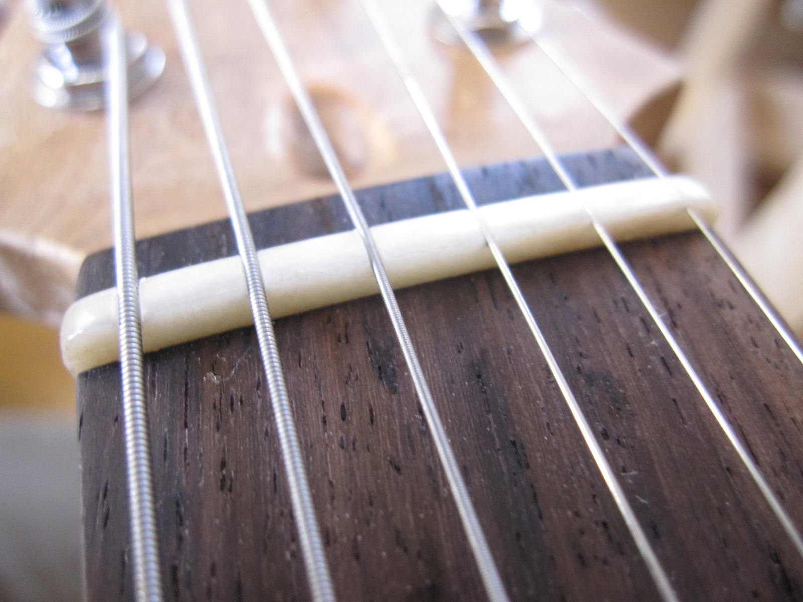 次は、弦をはって、ナット加工です。